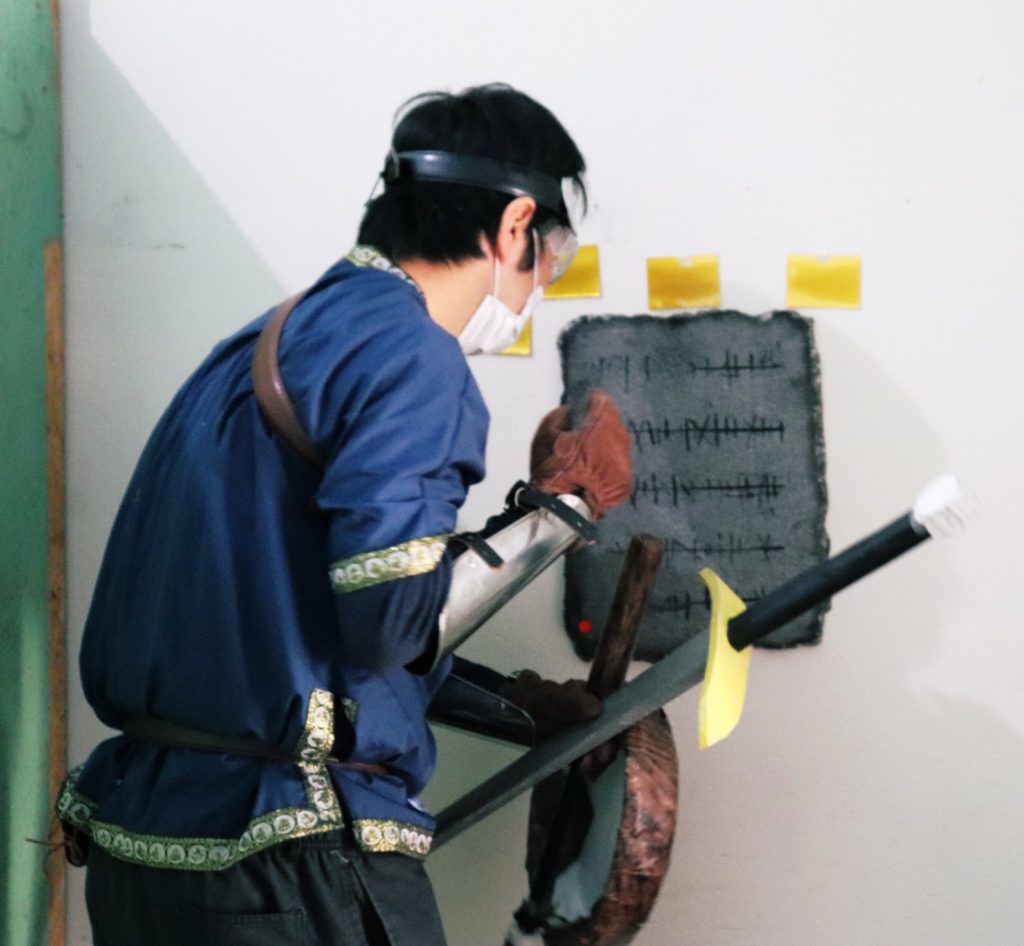 - 実際の遺跡の調査のように、ブラシで細かい砂や埃を落としながら、刻まれた言葉を浮き出させて解読する