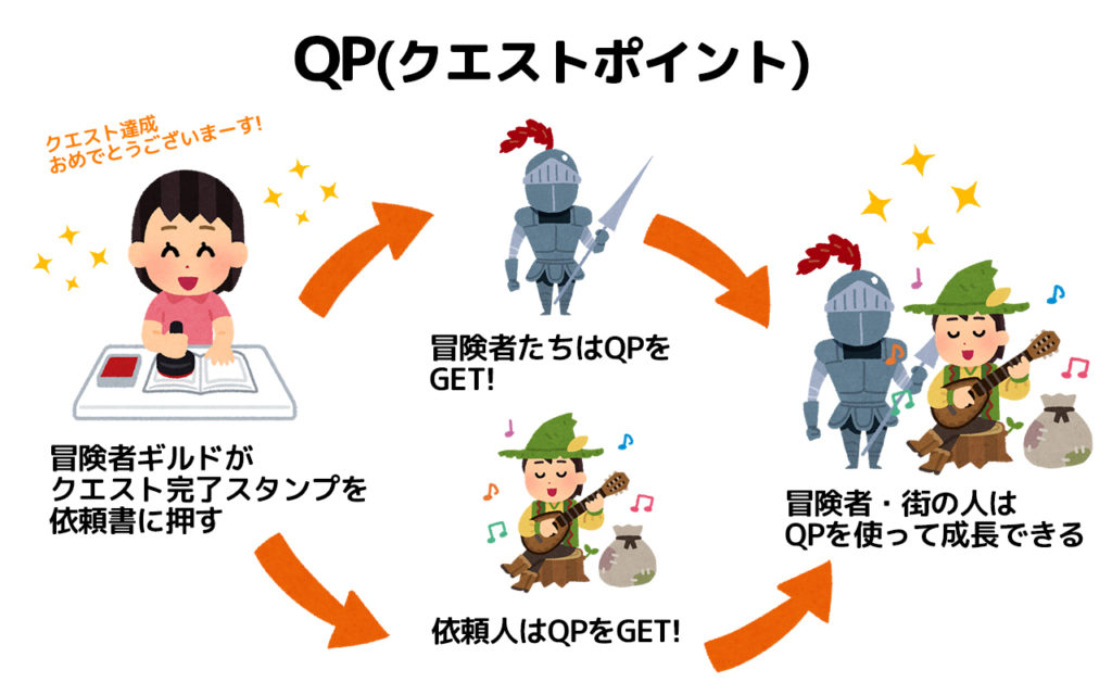 • 冒険者全員は、報酬と共にQPを依頼書に規定された点数分得られる(基本は1点)